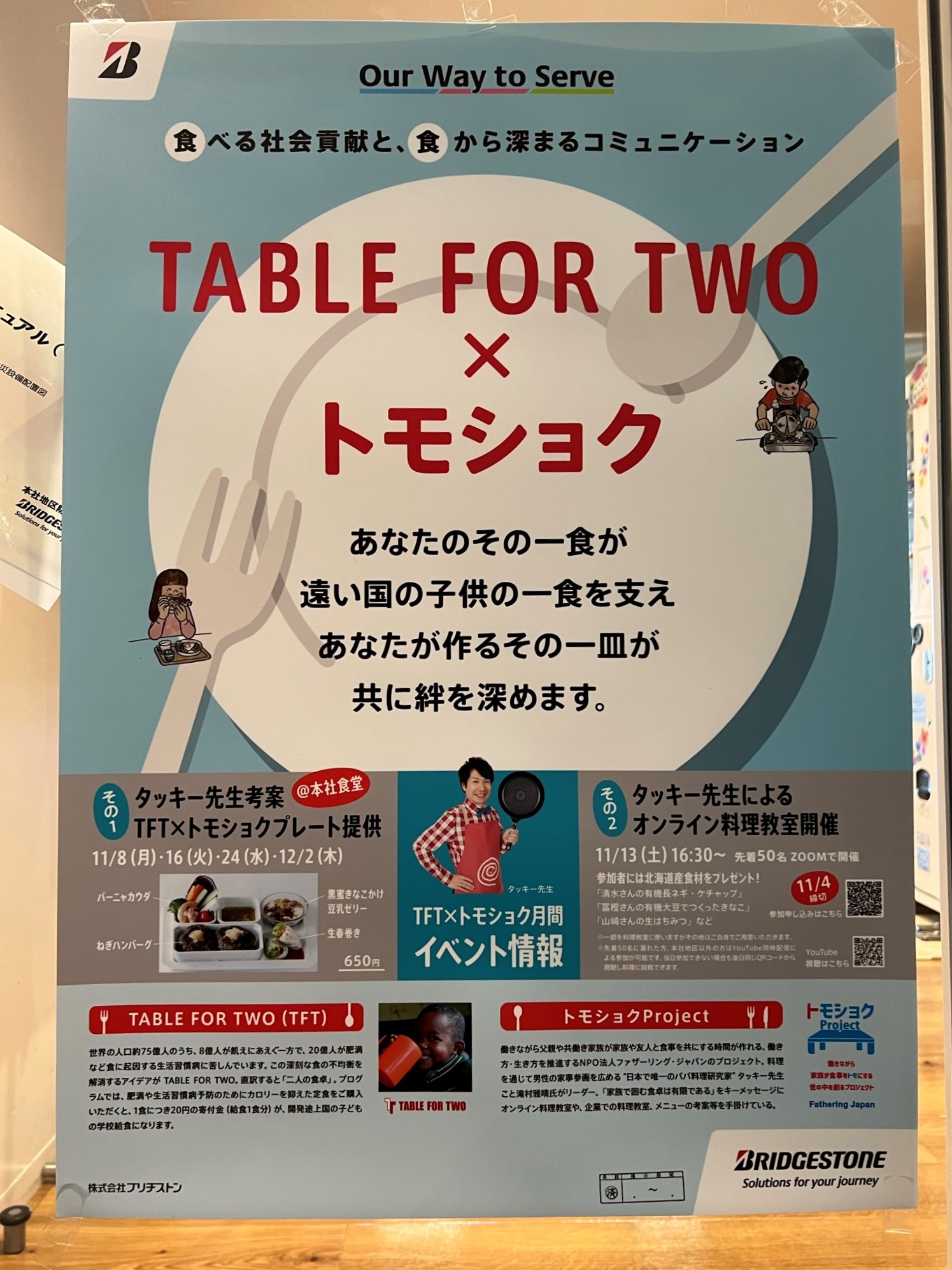 ブリヂストン社による、社内企画「TABLE FOR TWO×トモショク」企画の、社食レシピの考案と、北海道の食材を送付し、考案レシピを一緒に作るオンライン料理教室が2021年11月に開催されました。